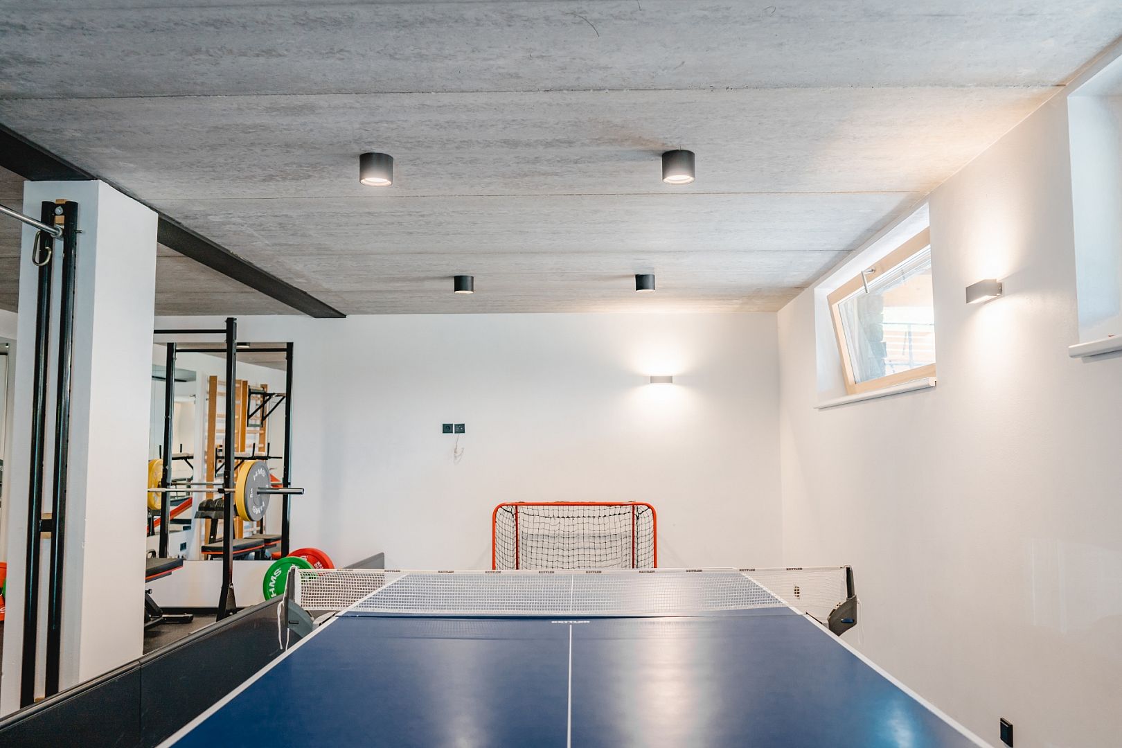 Máte rádi posilovnu? U nás v jedné ze společných místností najdete posilovnu s běhacím pásem, veslařským trenažerem, římskou osou, posilovací lavicí a hrazdou. Dále je ve stejné místnosti možnost rozložit stůl na ping-pong nebo vytvořit malé hřiště na florbal.
